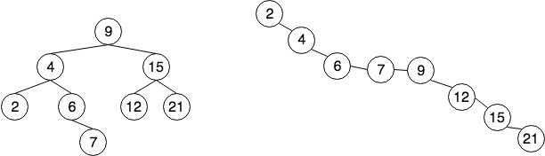 前面介绍的关于BST的操作其性能受BST的结构影响很大,例如,如果随机的给一组数据,得到的BST可能是平衡的,其高度为$\log{N}$,其检索时间会达到最好的$O(log_2{N})$;而如果有序的给一组数,则BST会退化为线性链表,其检索的时间复杂度则退化为$O(N)$。