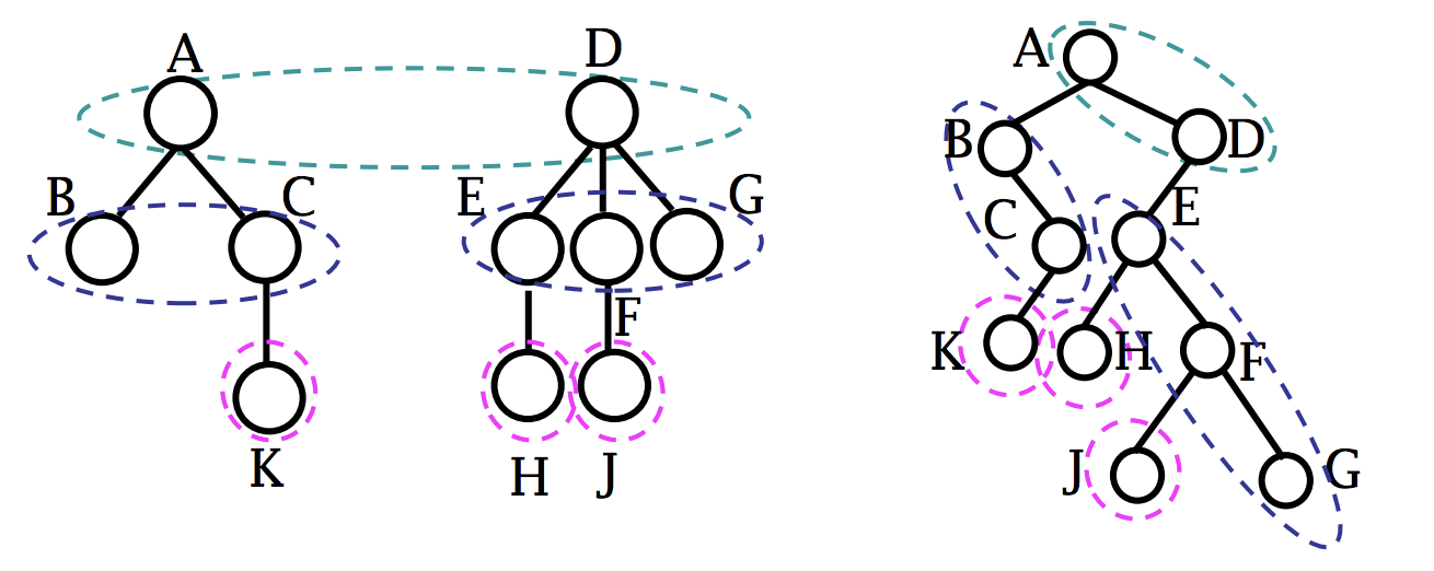 如上图所示,不难发现将上面虚线部分是一个递归合并的过程(将两棵子树合并成一课二叉树,而每棵子树又有自己的子树)。对于任意两棵子树,其合并的过程为: