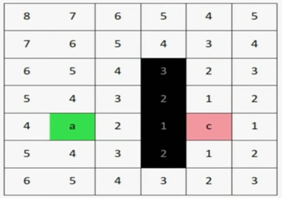 此时可以将Heuristic函数定义为:H(p1,p2) = abs(p1.x-p2.x) + abs(p1.-p2.y),则根据这个公式计算出的cost值如上图中每个格子所示,可以看到,从a点扩散出去的节点不再是等cost的,而是越偏向c点,cost的值越低。