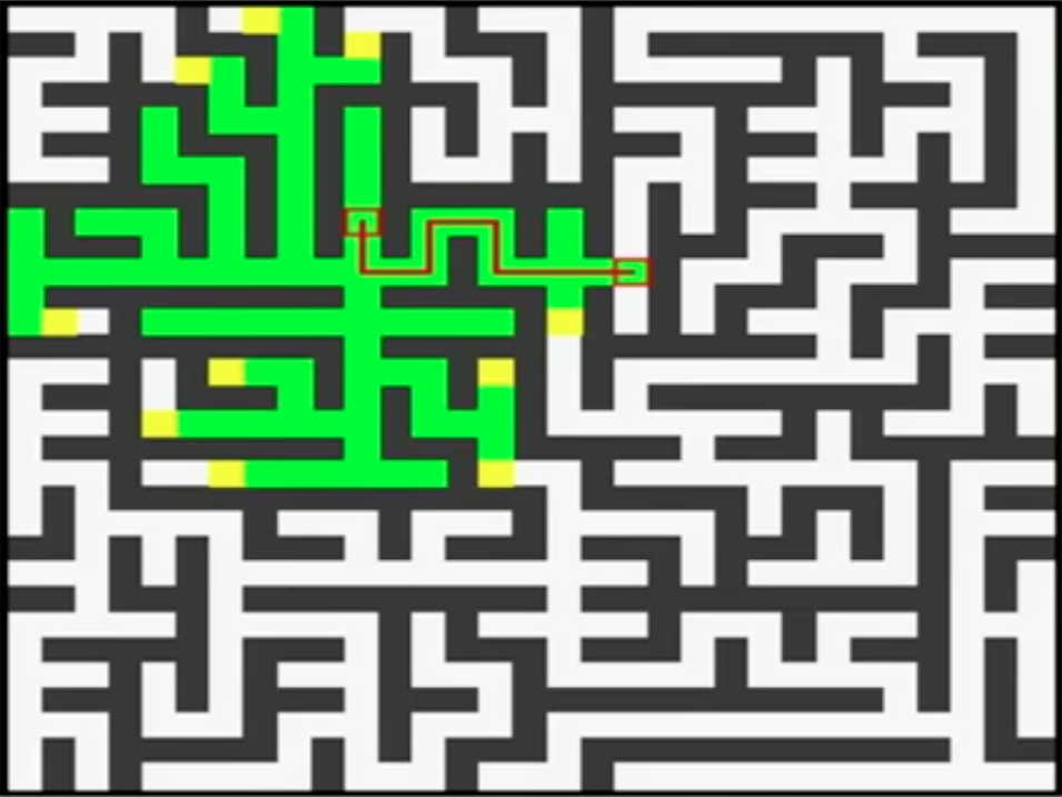 最后我们以一个迷宫的例子来直观的比较一下Dijkstra和A*算法的效率,如下图所示,左边为Dijkstra算法结果,需要走103步,右边是A*算法,只需要25步(图中格子之间路径的cost均为1)