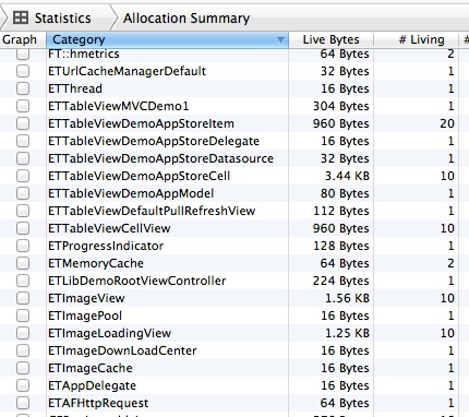 这个时候我们可以通过筛选类名前缀,来看当前存活的class,例如上图中,我的类名为ET开头,上面所有ET开头的类都是当前活跃在内存中的,我们可以看到有10个cell,20个item。此时我们退出这个界面,那么上面的对象,除了单例对象外应该全部释放掉。如果发现有没有释放的类名,则就要引起警惕了,要仔细排查没有dealloc的原因。