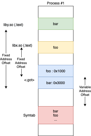上图中,两个进程的地址空间都有各自的GOT表,此时,对于libx.so中对于bar的调用转成了对GOT中bar的寻址。而由于在linking期间,libx.so和liby.so相对于GOT的offset是可以被确定的(具体来说,对于进程#1和进程#2,相对于GOT中bar符号的offset为-0x1000),因此,编译器可以为foo生成确定的汇编代码。