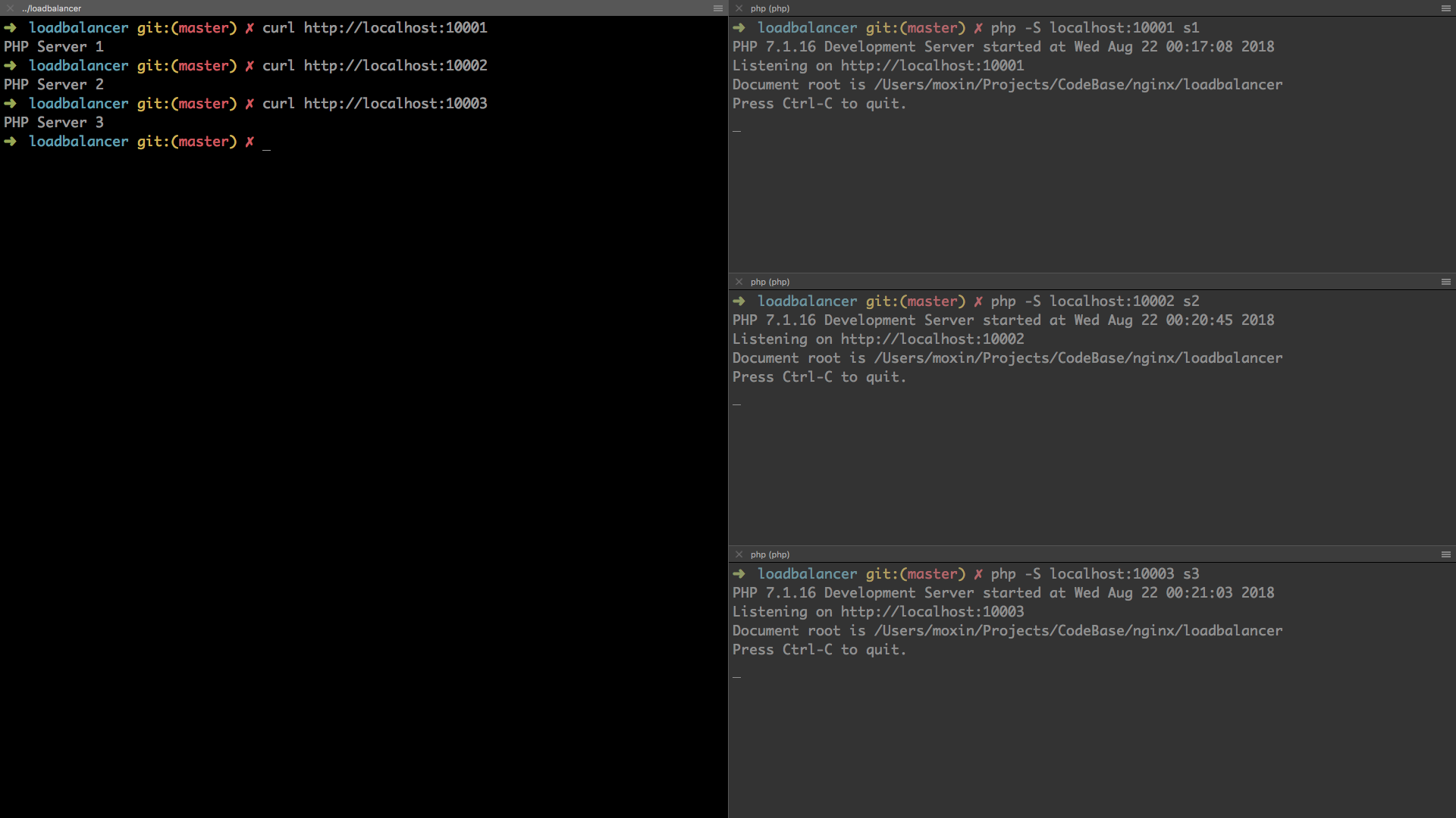 我们可以使用Nginx + PHP在本地简单模拟一个Load Balancer。由于Nginx默认提供对Load Balancer的支持,只需做简单配置即可。我们先在本地起三个Server,分别监听10001,10002,10003三个端口: