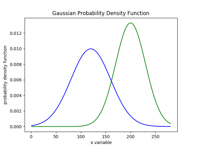 回到定位问题上,假设我们有一个先验的高斯概率密度函数为$f(x)$,其均值和方差分别为(mu=120, sigma=40),校验因子的概率密度函数为$g(x)$,其均值和方差分别为(mu=200,sigma=30),如下图所示