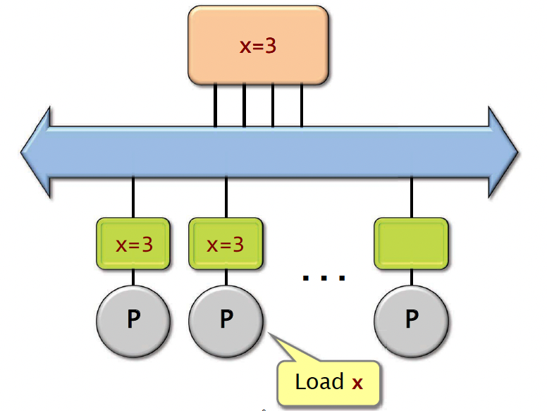 Let’s say we have a value x=3 in memory. If one processor says, we want to load x, what happens is that processor reads this value from a main memory, brings it into its own cache, and then it also reads the value, loads it into one of its registers. And it keeps this value in cache.