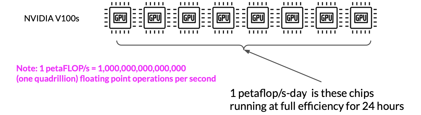 Let’s first define a unit of compute that quantifies the required resources. A petaFLOP per second day is a measurement of the number of floating point operations performed at a rate of one petaFLOP per second, running for an entire day